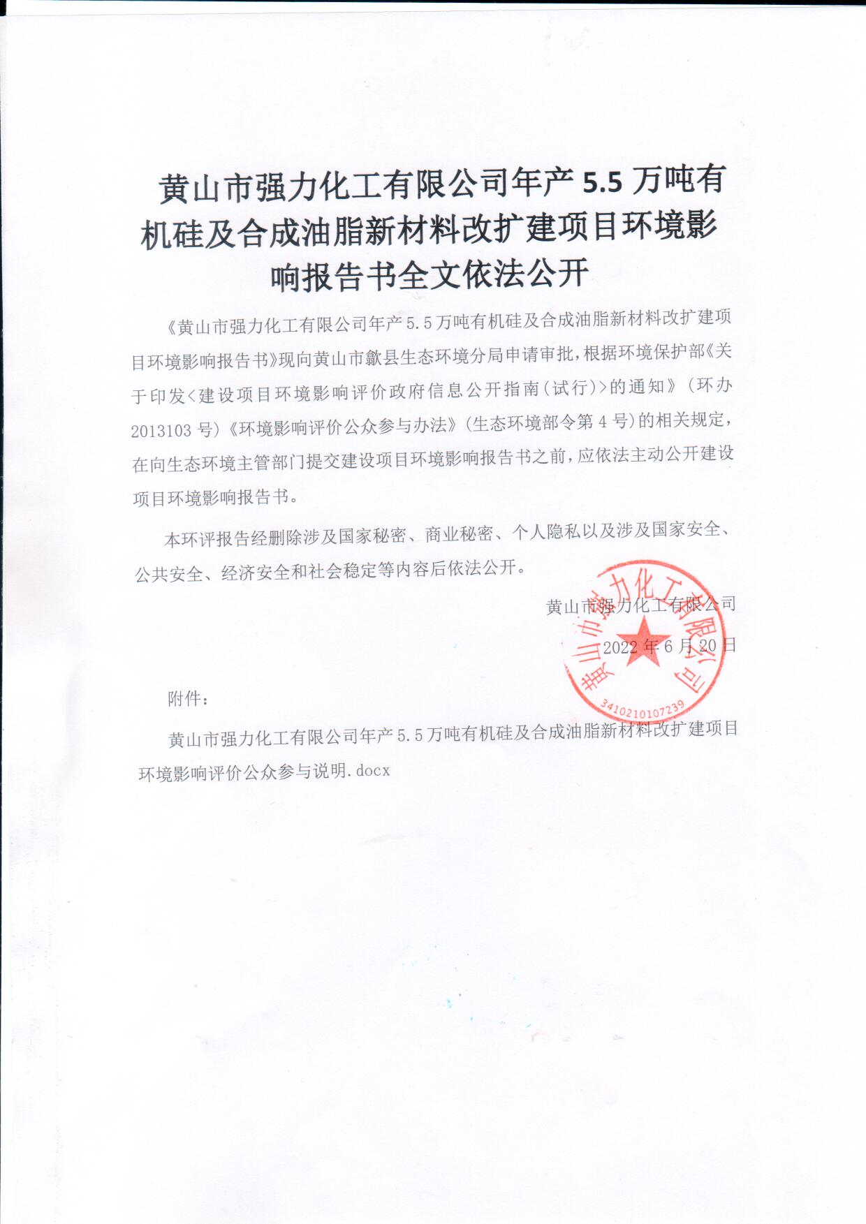 黃山市強力化工有限公司年產(chǎn)5.5萬噸有機硅及合成油脂新材料改擴建項目環(huán)境影響報告公參說明