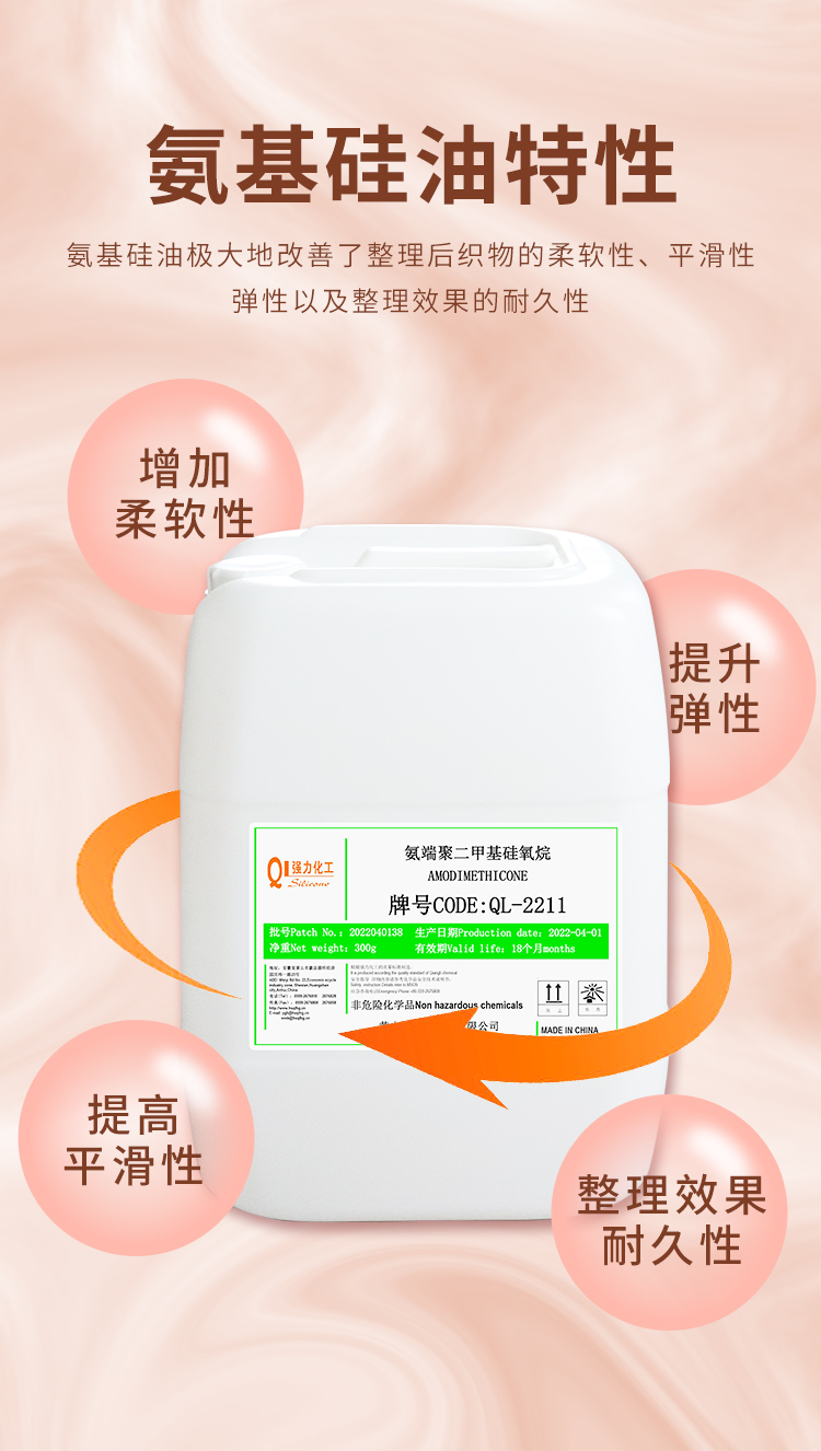 氨基硅油是專門用于紡織品柔軟整理劑的基本成份.它具有最佳的吸附性、相容性及易乳化性.使用混合器或均質(zhì)機(jī),氨基硅油容易被適當(dāng)?shù)谋砻婊钚詣┤榛煞€(wěn)定、透明的微乳液.它可以單獨(dú)使用,也可以與其它有機(jī)硅或有機(jī)柔軟劑組合成為特殊的柔軟整理劑,適用於各種紡織品的柔軟整理。