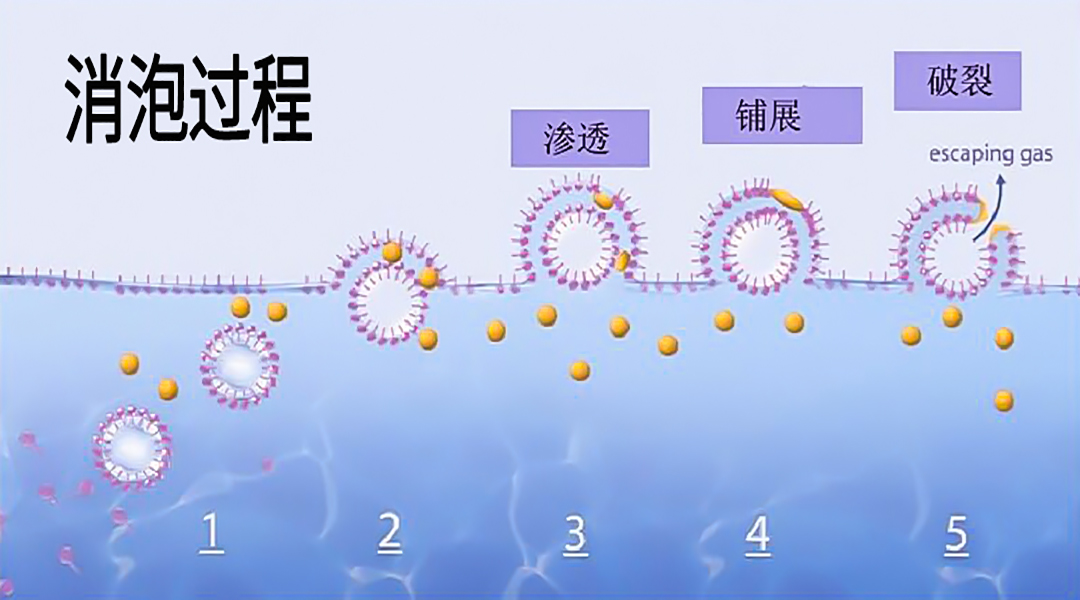 消泡劑的表面張力低,易于進(jìn)入液膜中并擴(kuò)展,降低液膜的表面張力,使液膜逐漸變薄,內(nèi)部受力不均勻,失去自我修復(fù)能力從而導(dǎo)致其破裂。