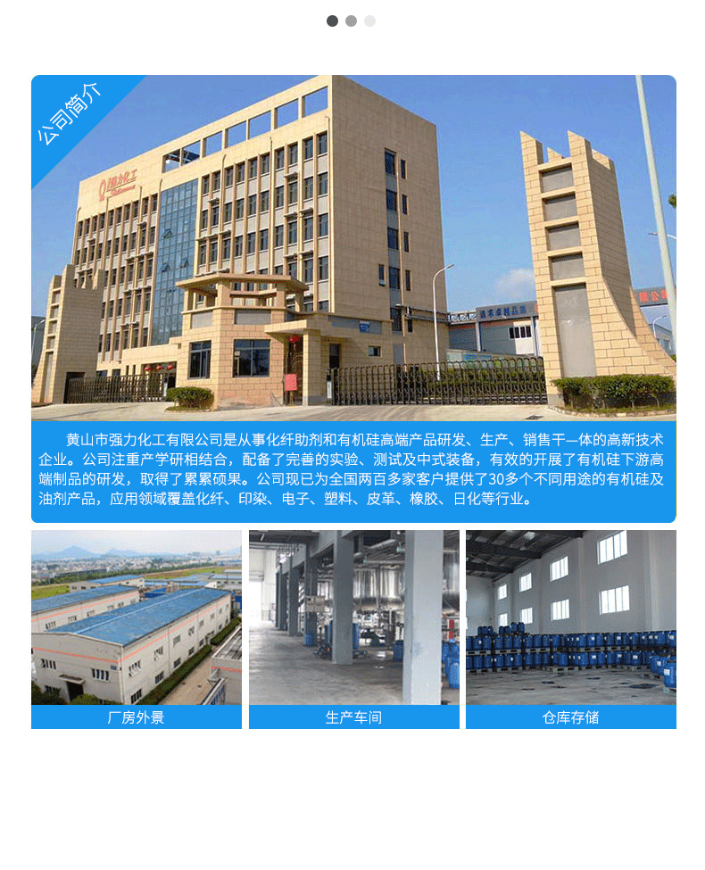 黃山市強(qiáng)力化工有限公司是一家專注于有機(jī)硅新材料,集研發(fā)、生產(chǎn)與銷售為一體的綜合性高新技術(shù)企業(yè)。公司已是有機(jī)硅行業(yè)內(nèi)較為知名的品牌,傾力于打造高品質(zhì)有機(jī)硅產(chǎn)品:二甲基硅油、乙烯基硅油、氨基硅油、乳化硅油、羥基硅油、含氫硅油與紡織品硅油等。砥礪前行,踔厲奮發(fā),強(qiáng)力純硅油,更高技術(shù),更好硅油。